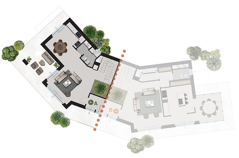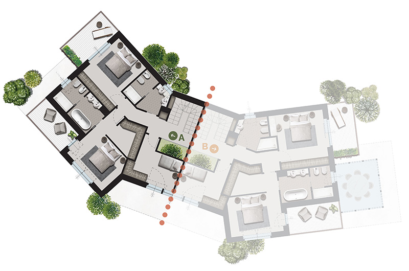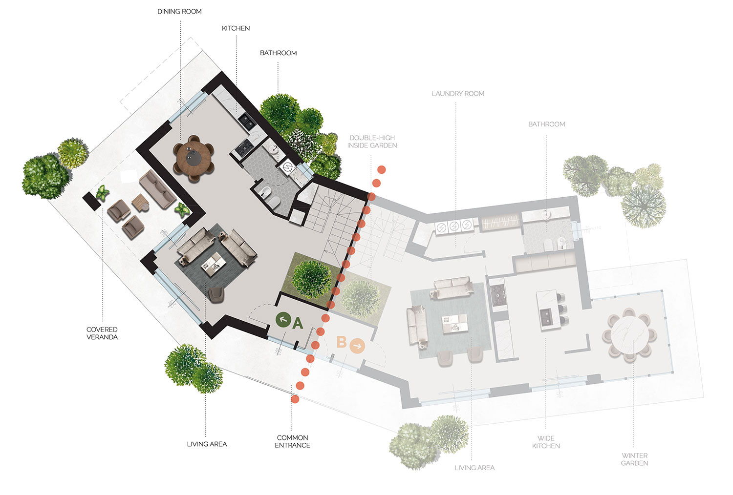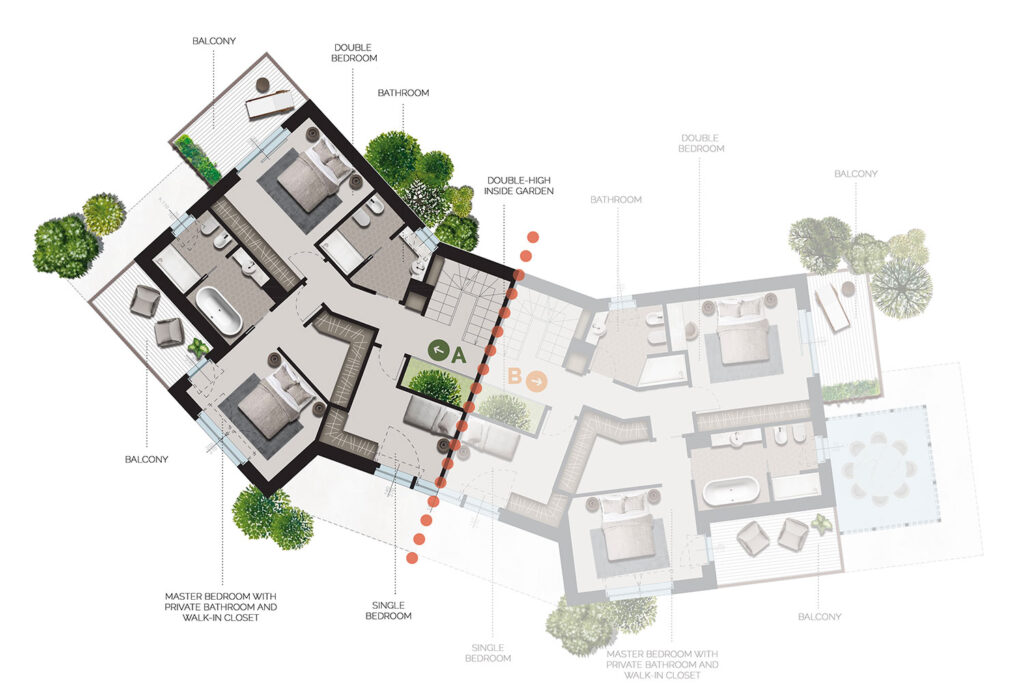 On the ground floor there is a living area composed of a living room, a kitchen, a covered veranda and a bathroom. The peculiarity of this space is the splendid double-high inside garden, perfectly merging with the surrounding space and making it unique.