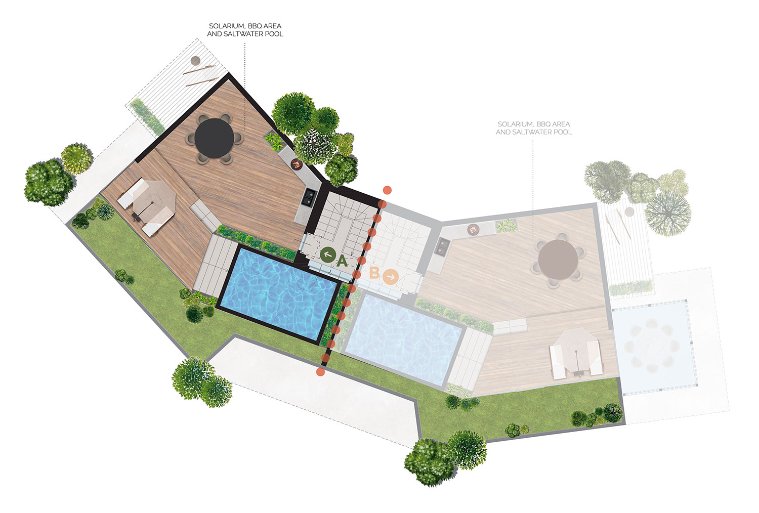 The top floor houses the real plus of the villa: a large swimming pool surrounded by a solarium, a barbecue area and an equipped kitchen.