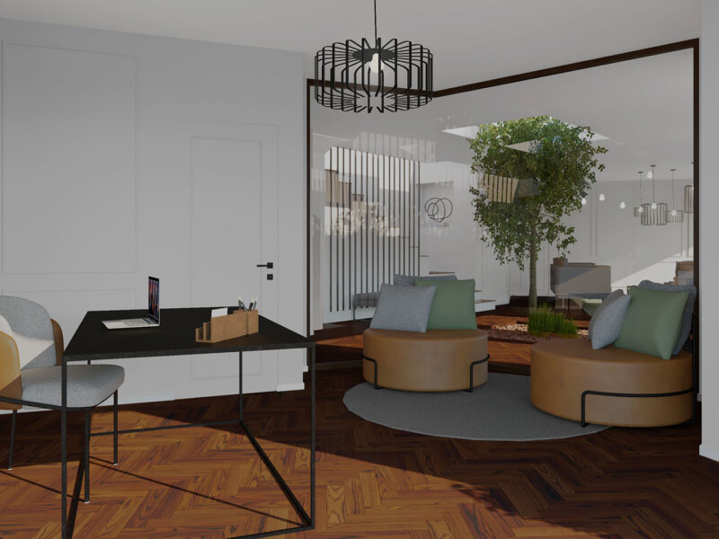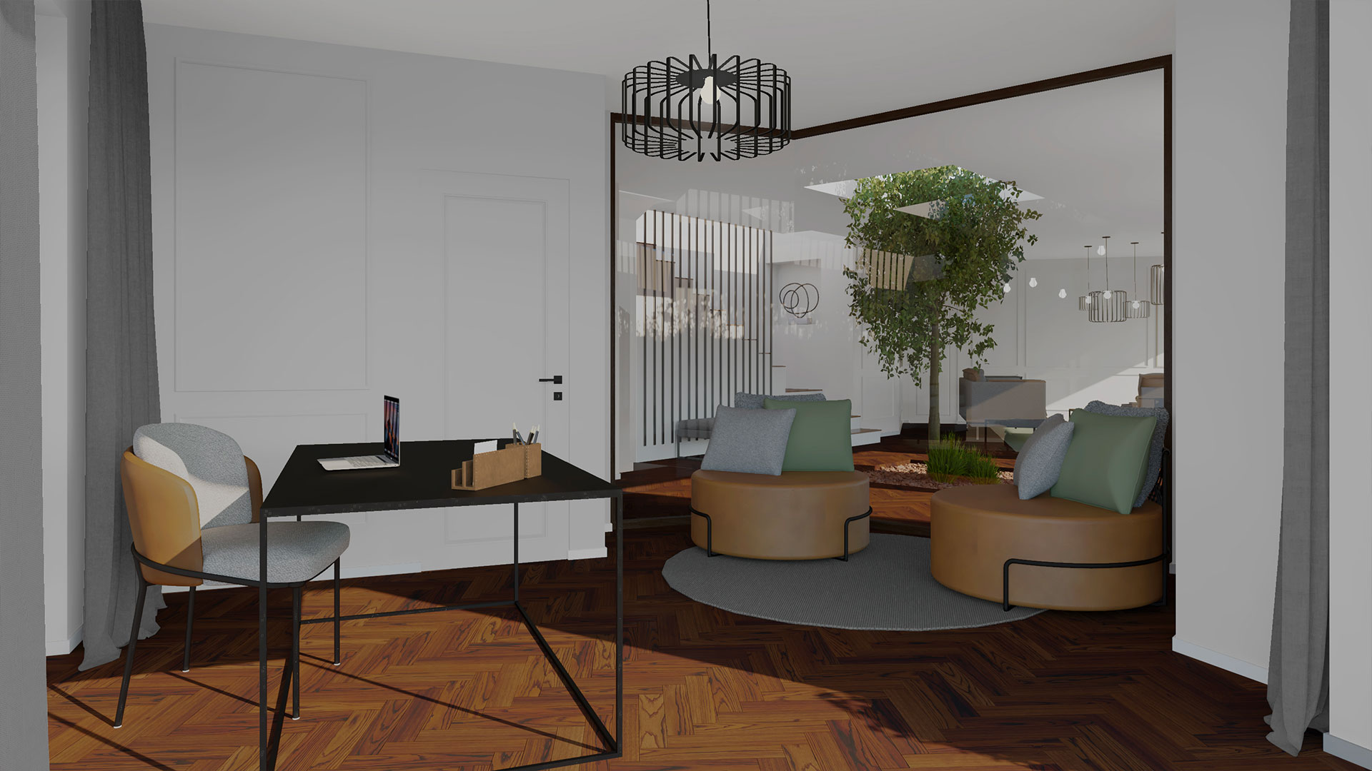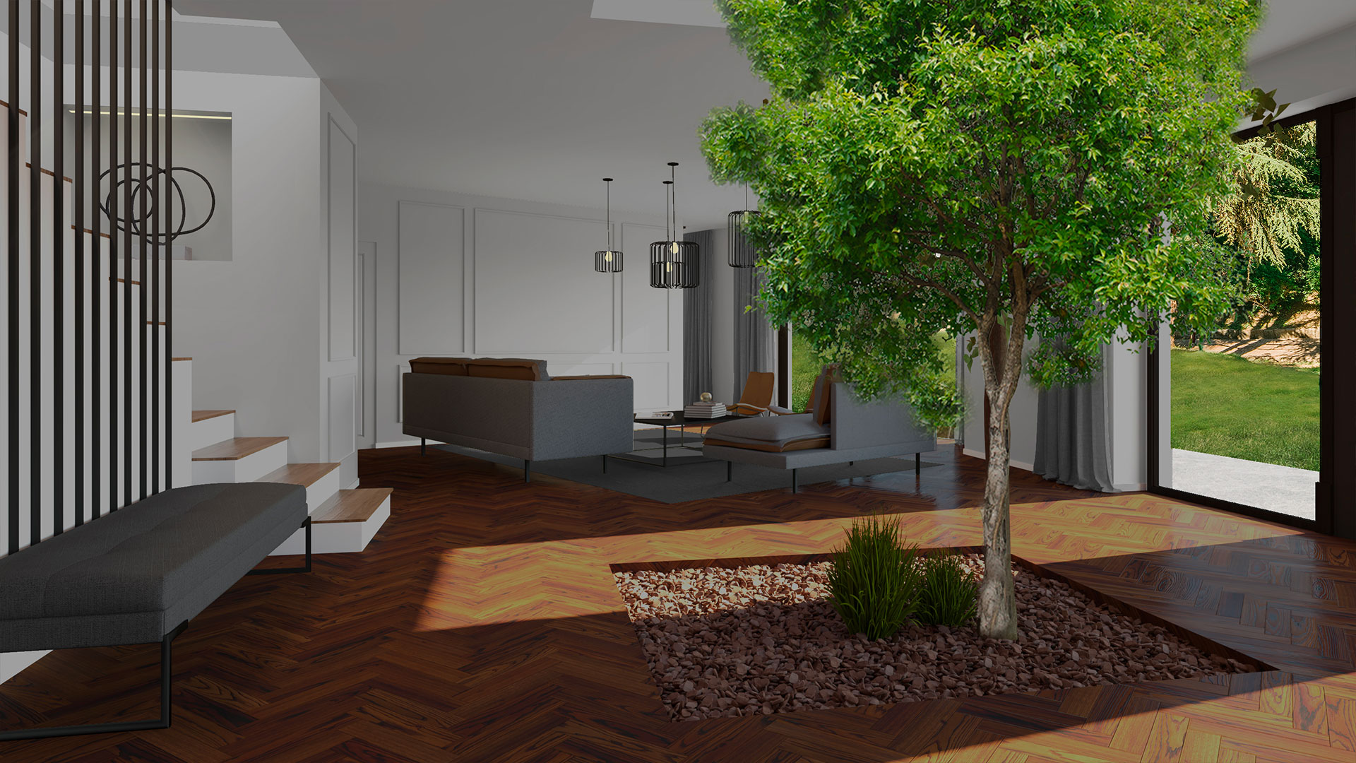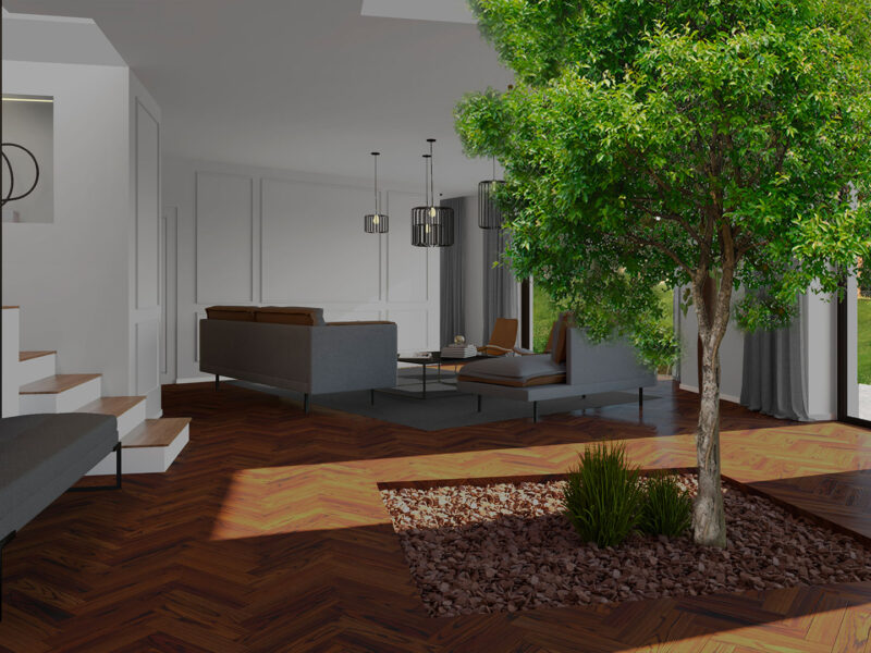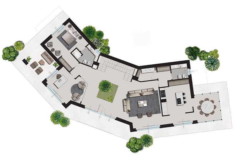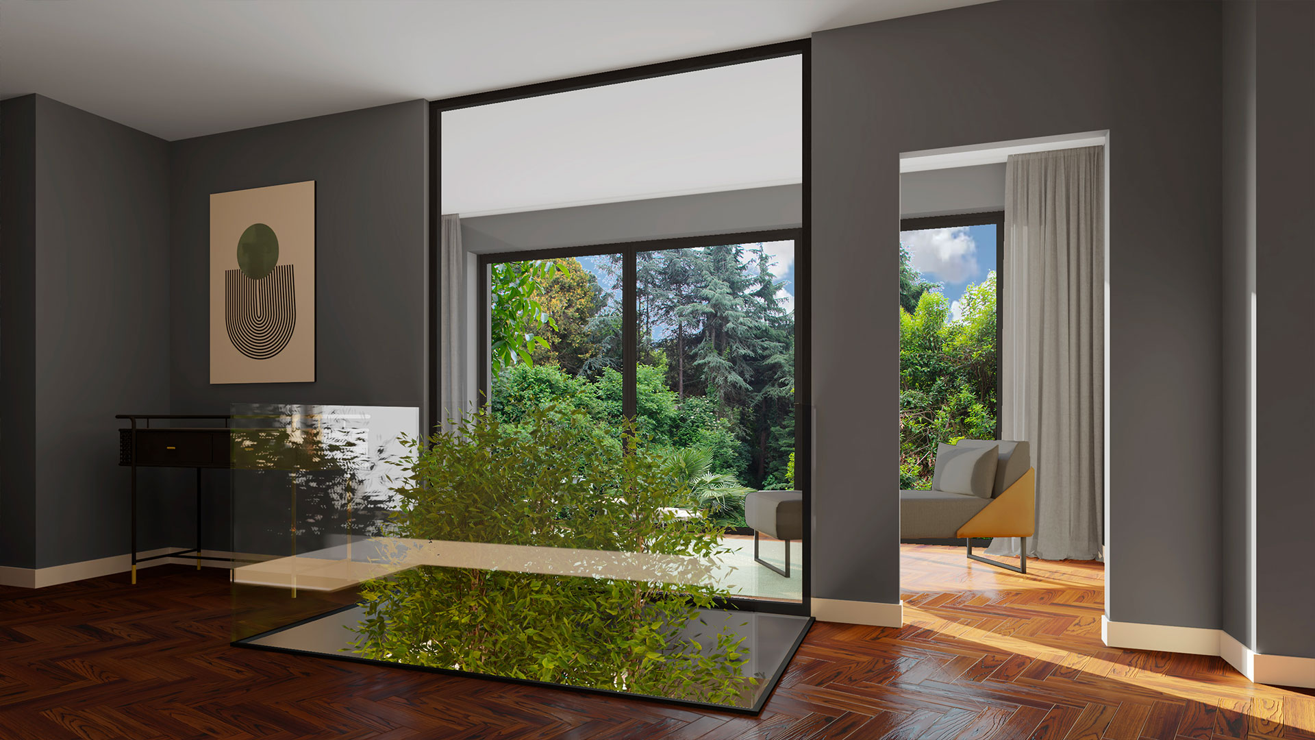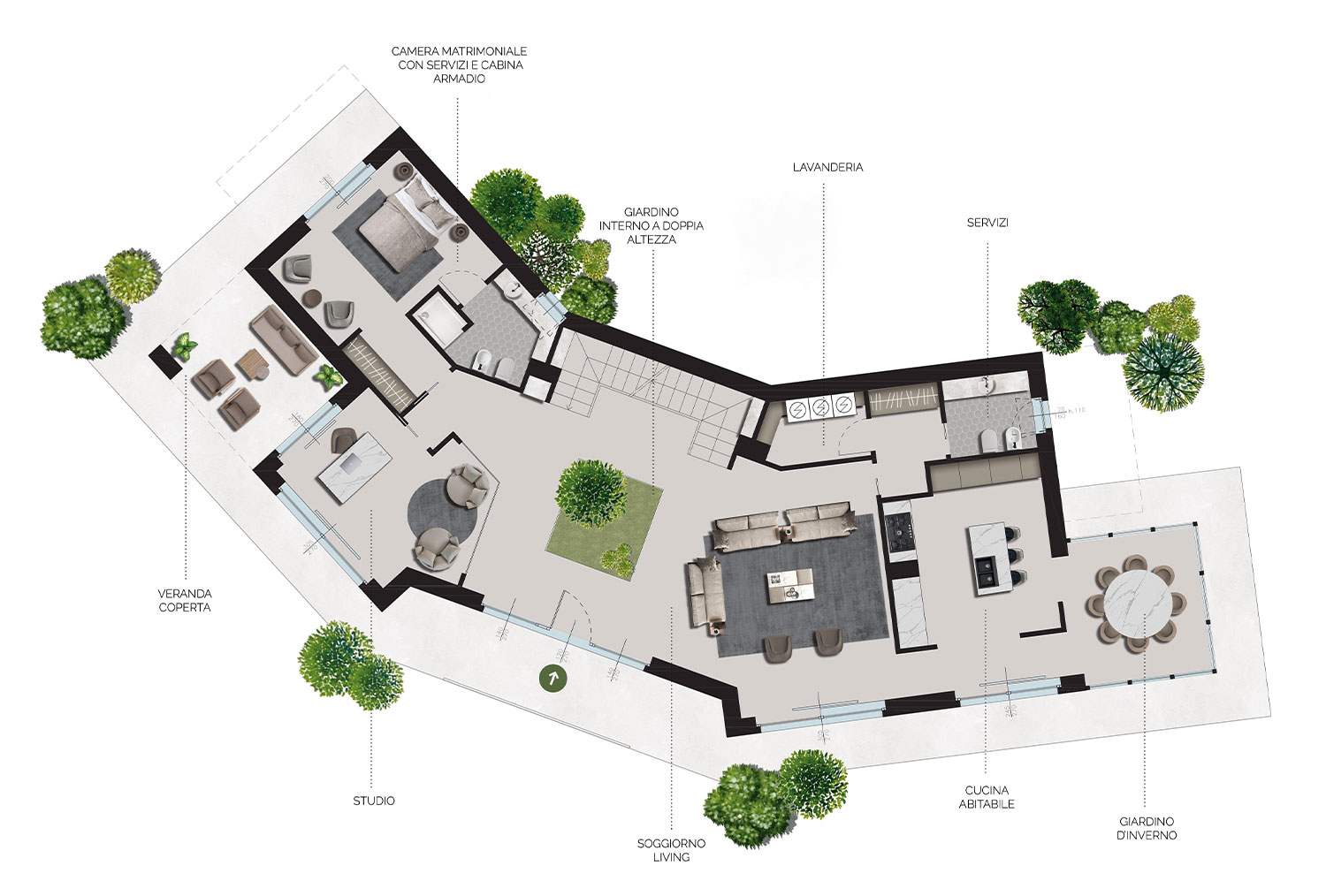 Al piano terra un’ampia zona giorno con ingresso living su soggiorno, impreziosito da un giardino interno a doppia altezza, con al centro un grande albero che diventa il punto focale di questo spazio, una spaziosa cucina e uno splendido giardino d’inverno caratterizzato da pareti e soffitto vetrato. Su questo stesso piano sono presenti una master-room con bagno privato pensata per gli ospiti, uno studio dalle pareti vetrate con affaccio su una veranda coperta, una lavanderia e un bagno di servizio.