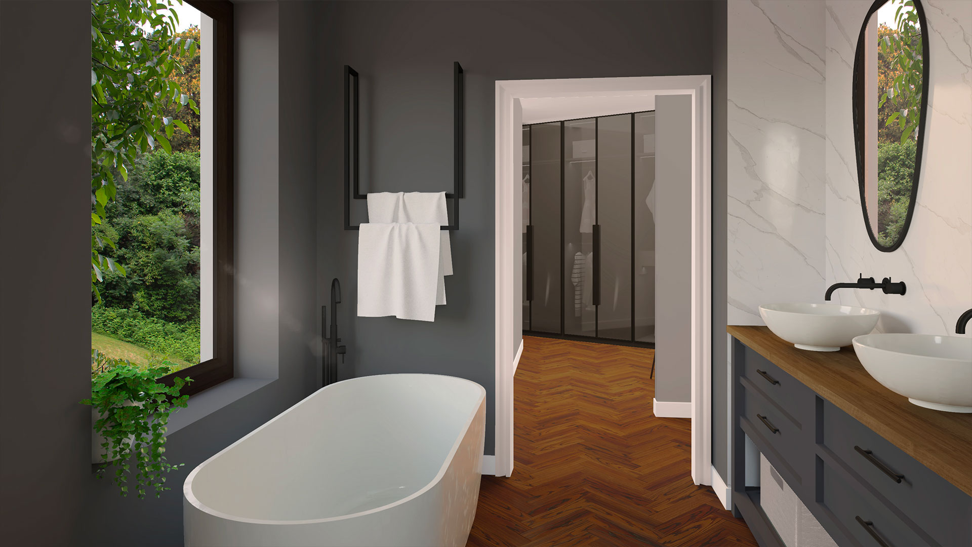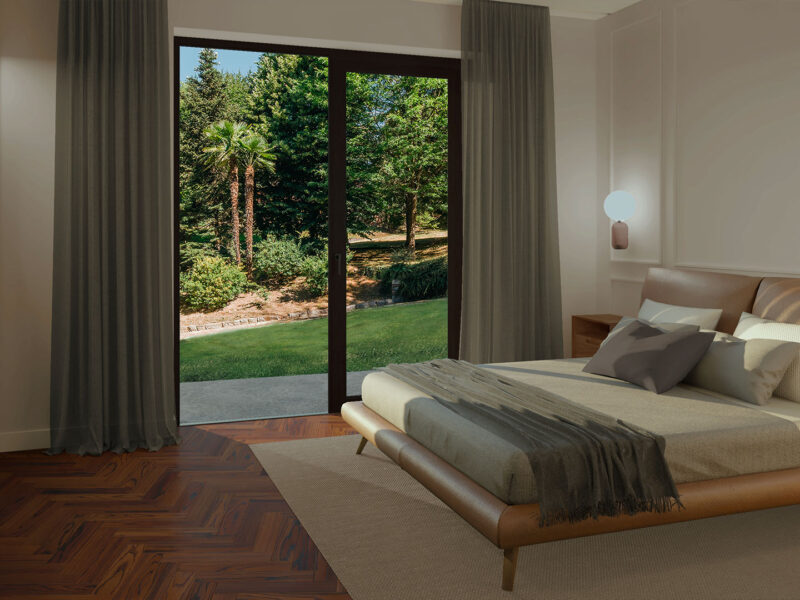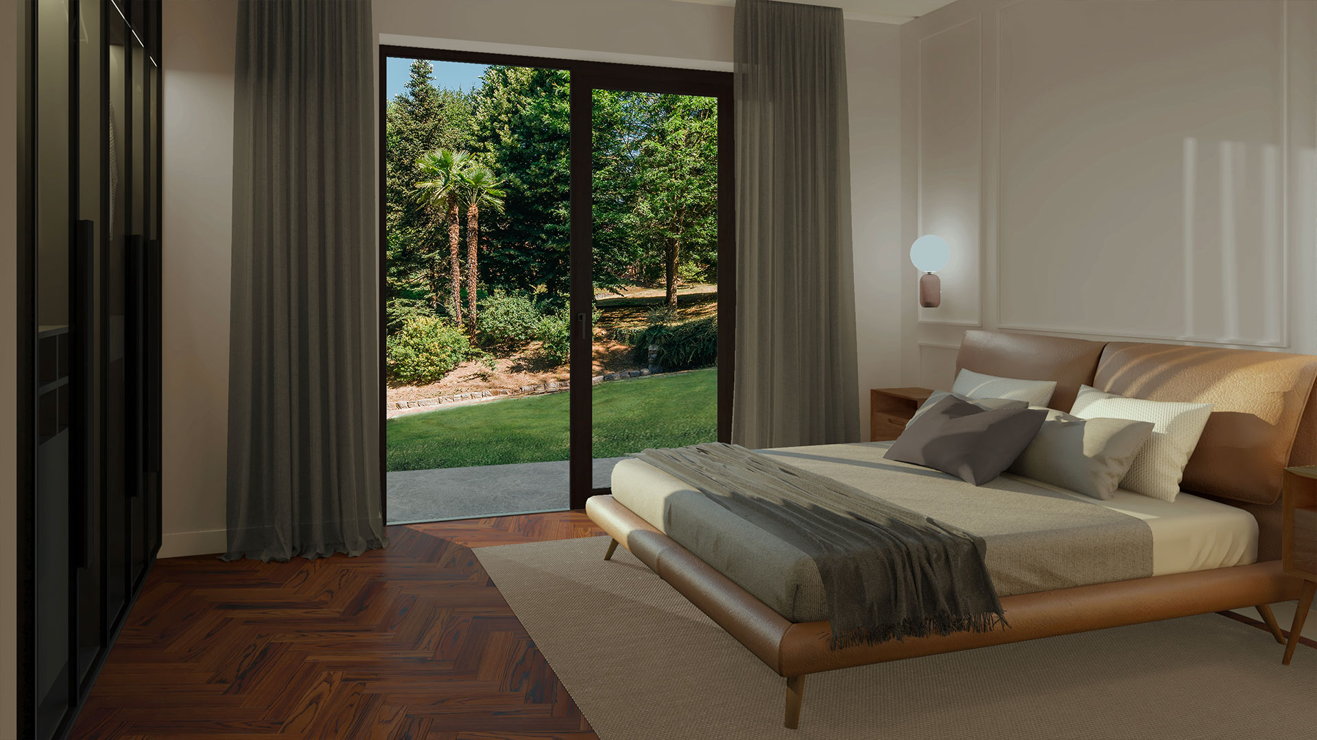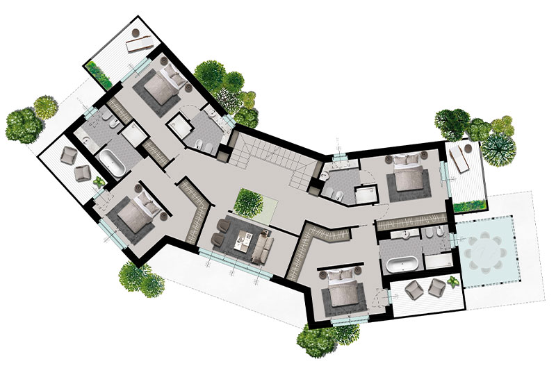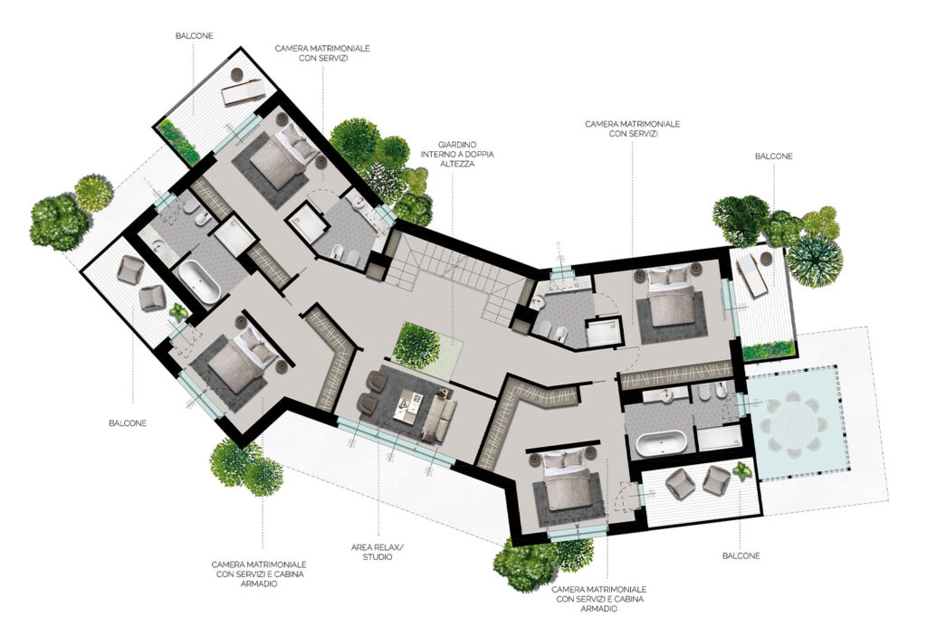 Il primo piano ospita la zona notte e un’area relax caratterizzata dall’affaccio sul giardino interno e vetrate a tutta altezza. Sono presenti due master-room, ognuna con cabina armadio e bagno privato con vasca, e altre due camere matrimoniali ognuna con bagno privato. Ogni camera si affaccia su un balcone che crea un’estensione degli ambienti anche all’esterno.