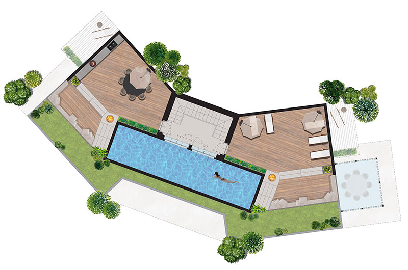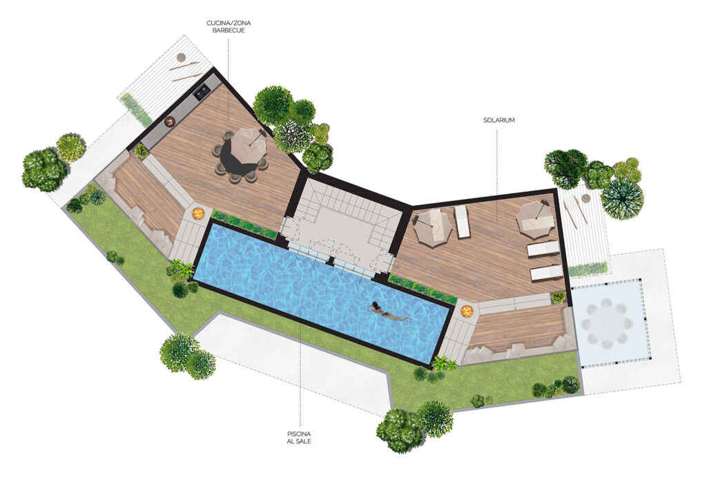 L’ultimo piano ospita il vero plus della villa: una splendida piscina al sale che si affaccia su un ampio solarium e un’area barbecue con cucina attrezzata, per godere di tutto il relax di cui hai bisogno senza muoverti da casa tua.